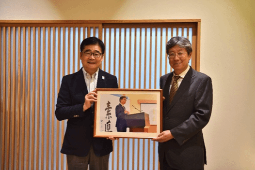 日本語学院院長、北京日本学研究センター主任の周異夫教授は、本間氏の提案による同センターの図書資料館への図書購入資金の寄付や学生への奨学金支援、また中国日本商会と日本語学院との協力関係の強化に感謝の意を示した。郭華偉書記は、パナソニックが百年にわたり成し遂げてきた発展と社会的責任への取り組みを高く評価し、松下幸之助氏の企業家精神が新時代のハイレベル人材の育成において大いに参考になると述べ、今後、日本企業との人材育成分野における交流と協力をさらに深化させていきたいとの期待を示した。会談後、周異夫教授は本間会長氏に、北京外国語大学で講演された際の記念写真をを贈呈した。