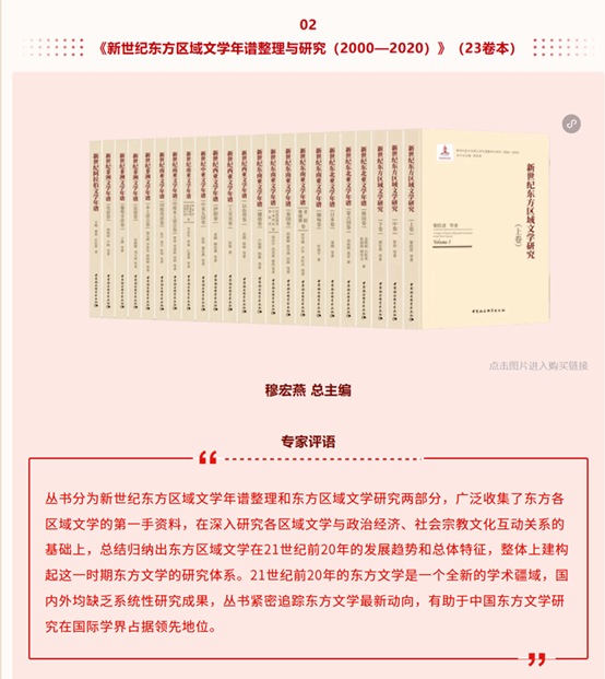 តាមស្ថិតិ ទីភ្នាក់ងារសារព័ត៌មានវិទ្យាសាស្ត្រសង្គមចិនបានបោះពុម្ពផ្សាយសៀវភៅប្រមាណ ២០០០ ក្បាល ក្នុងនោះមានសៀវភៅចំនួន ២៣ ក្បាលត្រូវបានជ្រើសរើសជាសៀវភៅឆ្នើម។ សៀវភៅ "ការចងក្រង និងស្រាវជ្រាវប្រវត្តិអក្សរសិល្ប៍តំបន់បូព៌ាក្នុងសតវត្សរ៍ថ្មី" (២៣ ភាគ) ដែលមានលោកស្រីសាស្ត្រាចារ្យ មូ ហុងយ៉ាន មកពីមហាវិទ្យាល័យសិក្សាអាស៊ី ជានិពន្ធនាយកនោះ ត្រូវបានជ្រើសរើស និងដាក់បញ្ចូលក្នុងបញ្ជីសៀវភៅឆ្នើមរបស់ទីភ្នាក់ងារសារព័ត៌មានវិទ្យាសាស្ត្រសង្គមចិនឆ្នាំ ២០២៥។